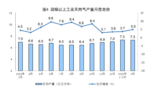 0 04-16 10:12国家统计局:3月份,规上工业天然气产量同比增长5.0%